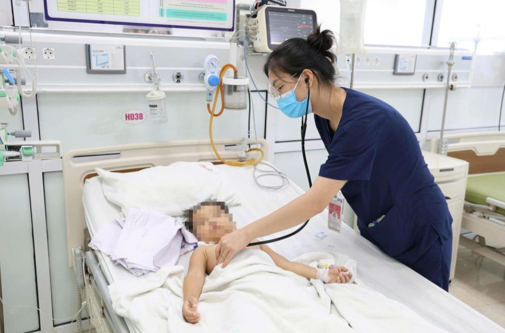 Tại khoa Hồi sức tích cực - Chống độc, bệnh nhi được điều trị trị liệu máy theo chiến lược thông khí bảo vệ phổi, hồi sức tuần hoàn và sử dụng kháng sinh làm tình trạng viêm nặng.