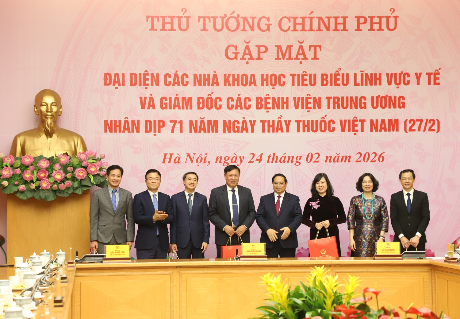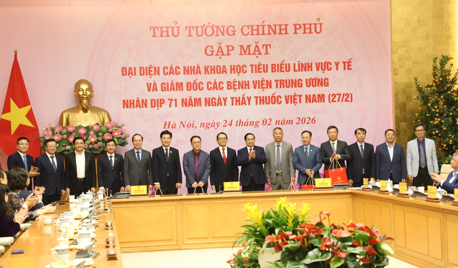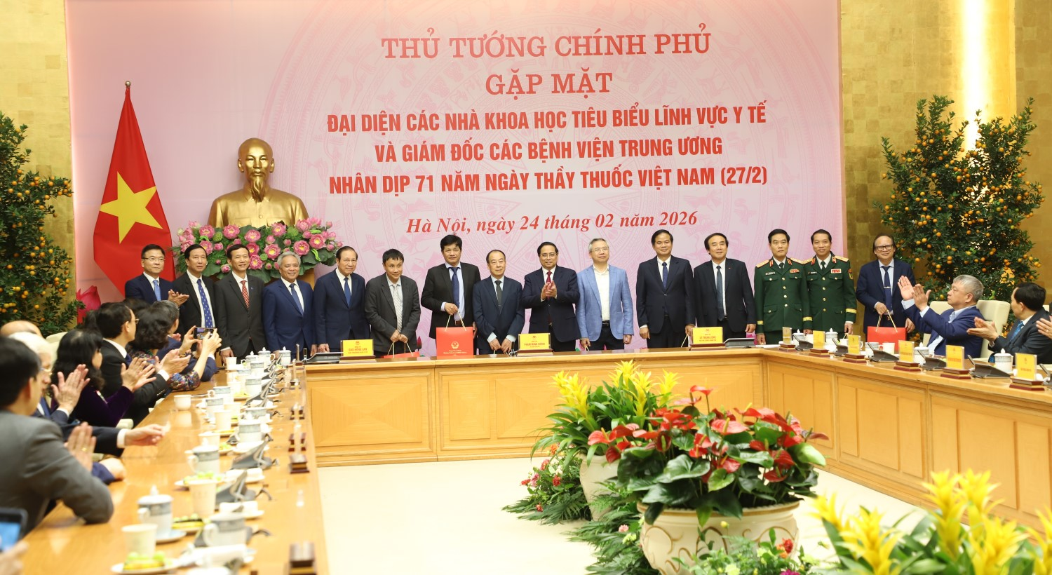 Chiều 24/02/2026, tại Hà Nội, Thủ tướng Chính phủ Phạm Minh Chính gặp mặt đại diện các nhà khoa học tiêu biểu lĩnh vực y tế và Giám đốc các bệnh viện Trung ương nhân dịp kỷ niệm 71 năm Ngày Thầy thuốc Việt Nam (27/02/1955-27/02/2026).