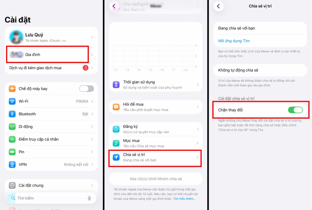 Cài đặt này nằm trong mục Gia đình, chọn tên trẻ, tìm mục Chia sẻ vị trí và bật Chặn thay đổi.