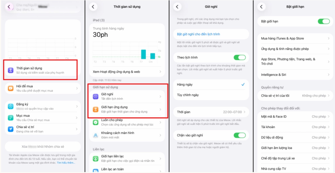 Apple cho phép thiết lập hai loại giới hạn chính, gồm giới hạn sử dụng (giờ nghỉ, ứng dụng, khoảng cách màn hình) và giới hạn liên lạc.
