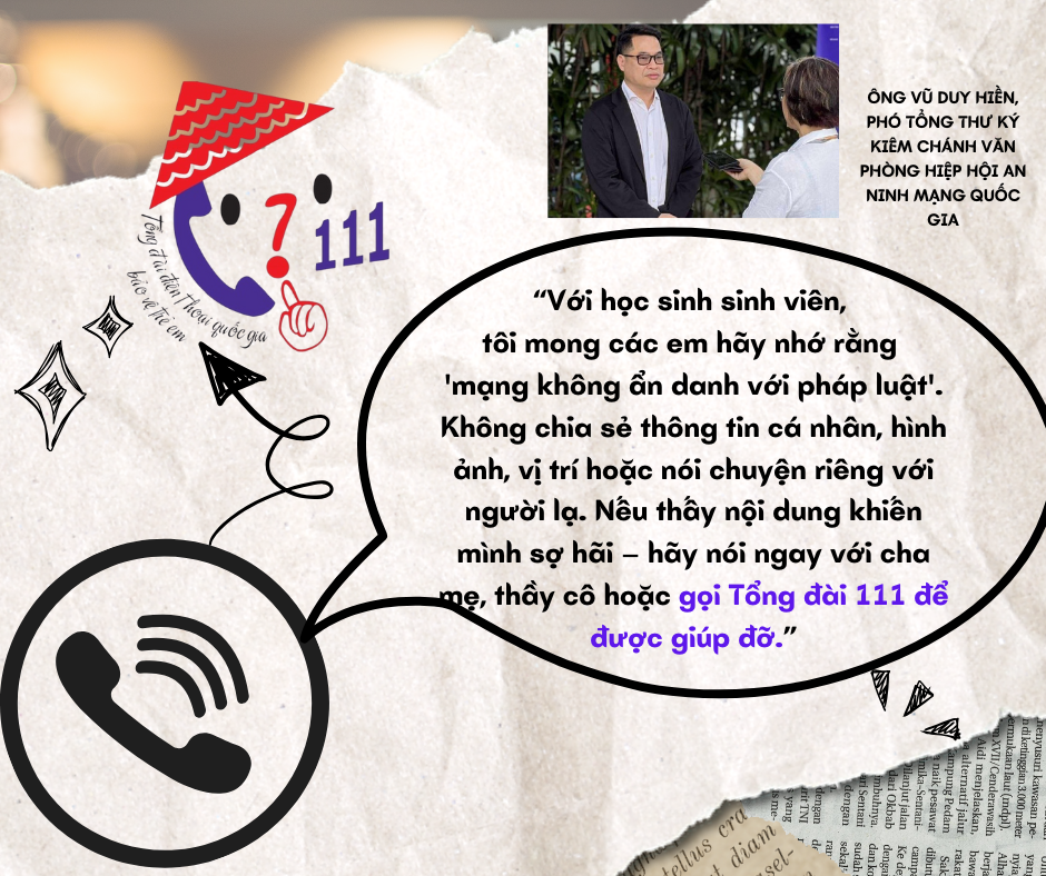 Ông Vũ Duy Hiền: Với học sinh sinh viên, tôi mong các em hãy nhớ rằng 'mạng không giấu danh pháp luật'. Không chia sẻ thông tin cá nhân, hình ảnh, vị trí hoặc nói chuyện riêng với người lạ. Nếu thấy nội dung tạo ra nỗi sợ hãi của mình – hãy nói ngay với cha mẹ, thầy cô hoặc gọi Tổng đài 111 để được giúp đỡ. Với phụ huynh: hãy dạy cách phòng tránh thay vì cấm, đồng hành và tạo niềm tin để sẵn sàng chia sẻ khi gặp nguy hiểm. Với giáo viên: hãy trở thành thành viên 'lá mềm' trong trường học, giúp học sinh rèn kỹ năng ứng dụng, nhận diện chương trình và tìm kiếm sự hỗ trợ.